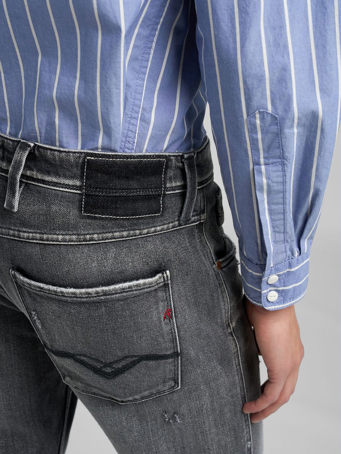 Slim-fit jeans with a regular rise and a slim leg that tapers toward the hem. This five-pocket piece comes in comfortable 11-oz black cotton denim with a white weft in a mid wash and stands out for its hand-made whiskering and scraping, mended breaks and light all-over brushwork. The iconic gull-wing stitching decorates the coin pocket and back pockets, one of which is also embroidered with the letter R. Zip and button fastening.