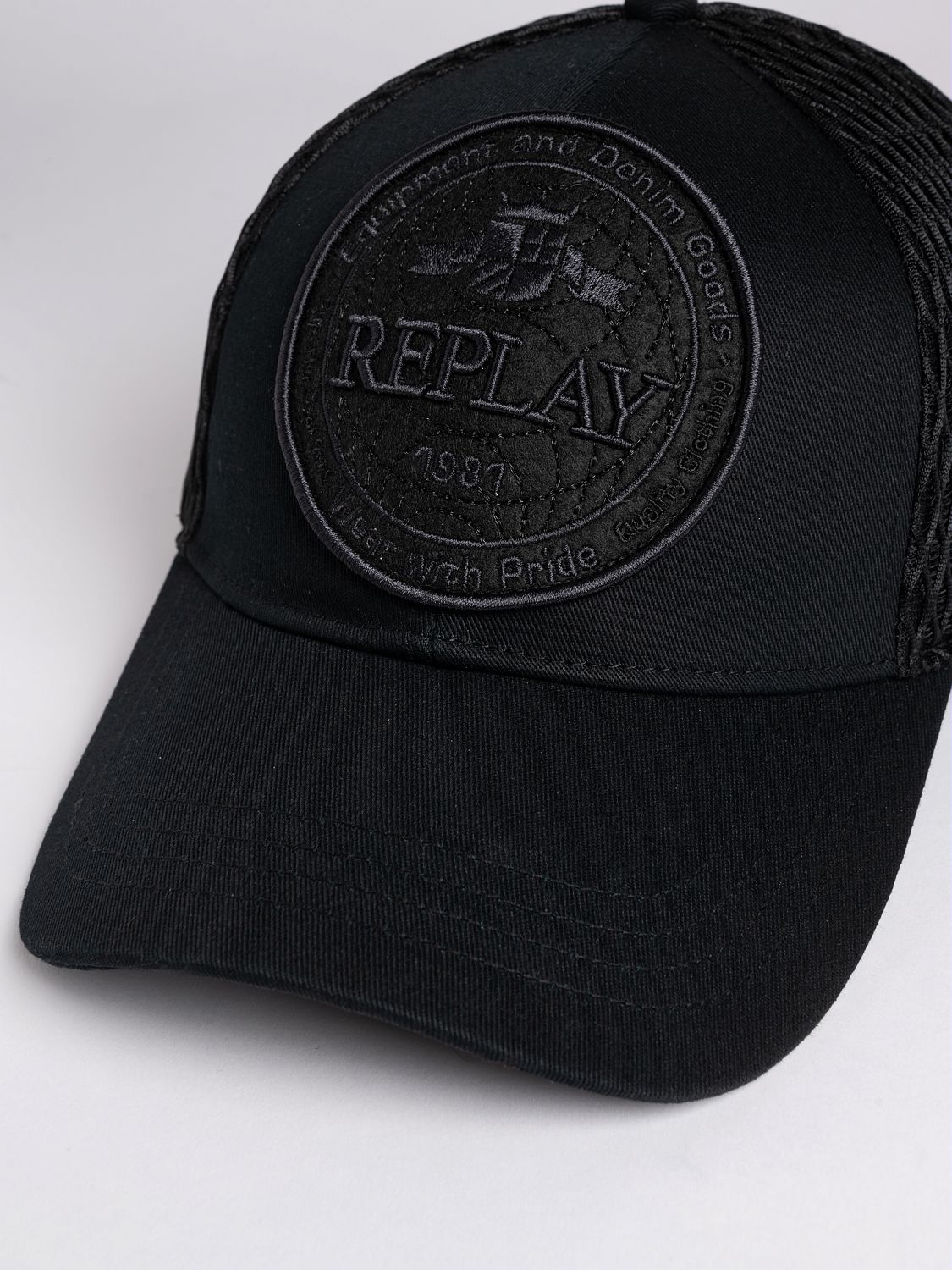 Cotton twill baseball cap with a curved peak and a mesh insert. It features a circular patch on the front with embroidered lettering. Adjustable press-stud fastening.