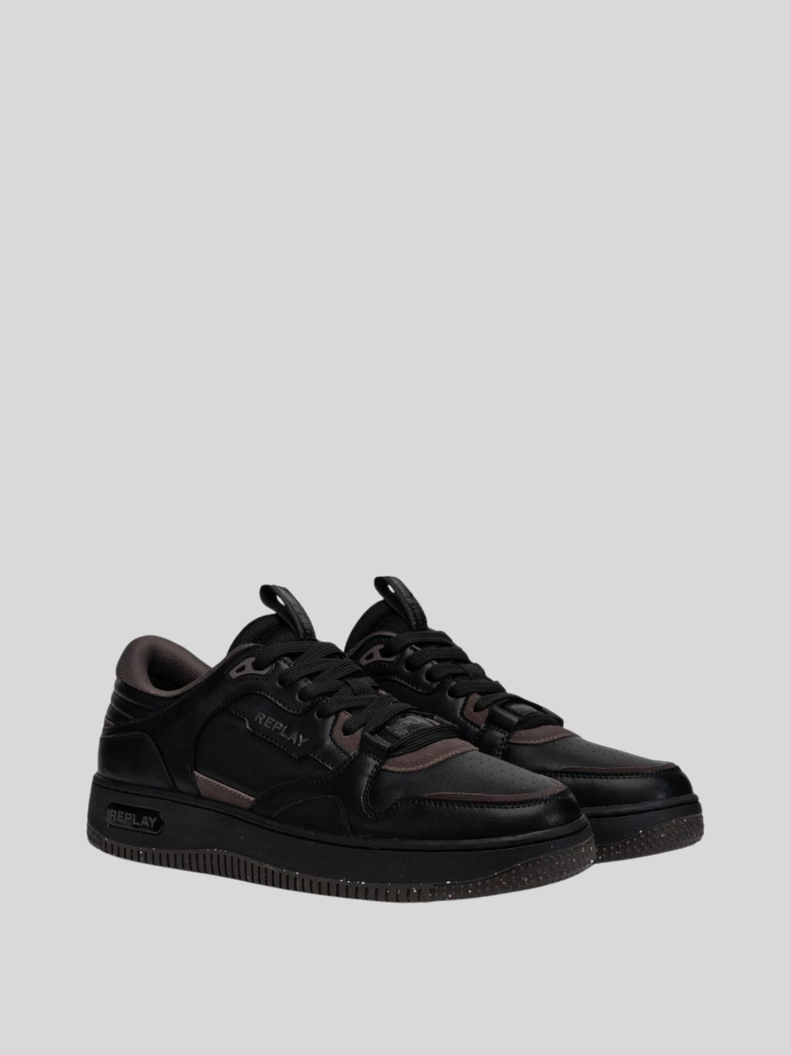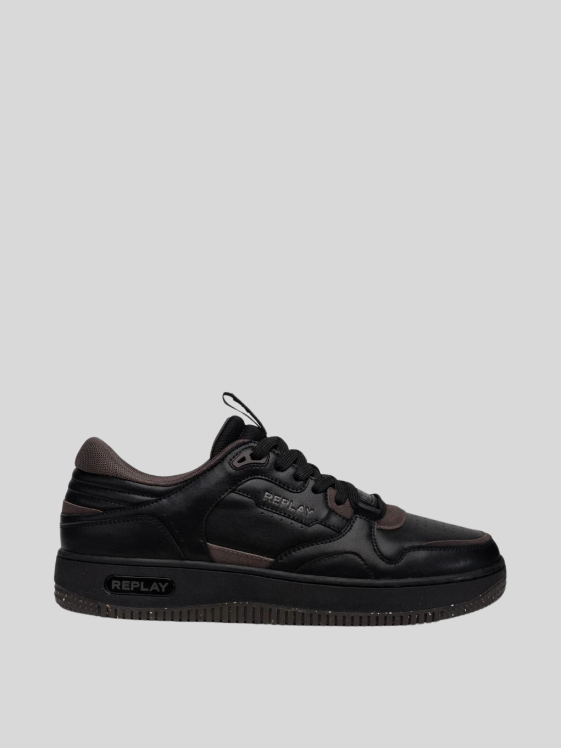 Epic M Base lace-up sneakers featuring a soft leather upper and chunky rubber sole. The design features a contrasting padded collar, pull-tab on the tongue and micro-perforated details. The logo lettering, the embodiment of Replay’s DNA, is found on the sole, tongue and side insert.