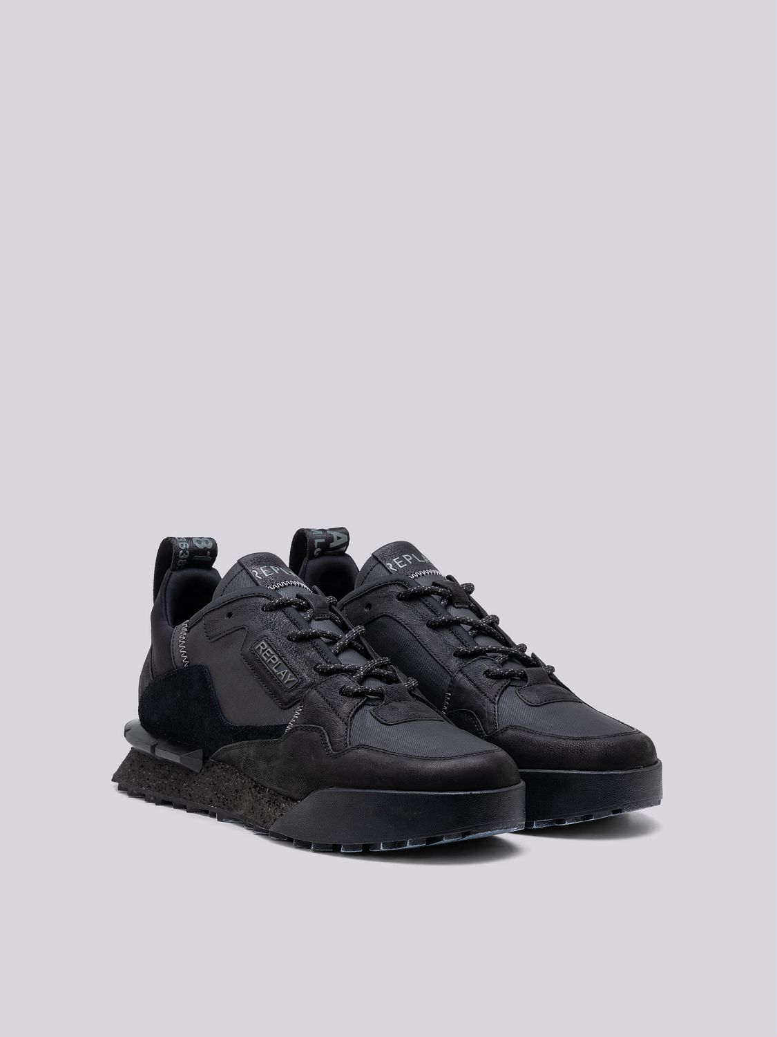 Field Melt lace-up sneakers featuring an upper with leather and suede inserts. The chunky sole comes in technical material. The embossed lettering logo on the side and the custom tape pull-tab on the heel convey the character of Replay’s DNA.