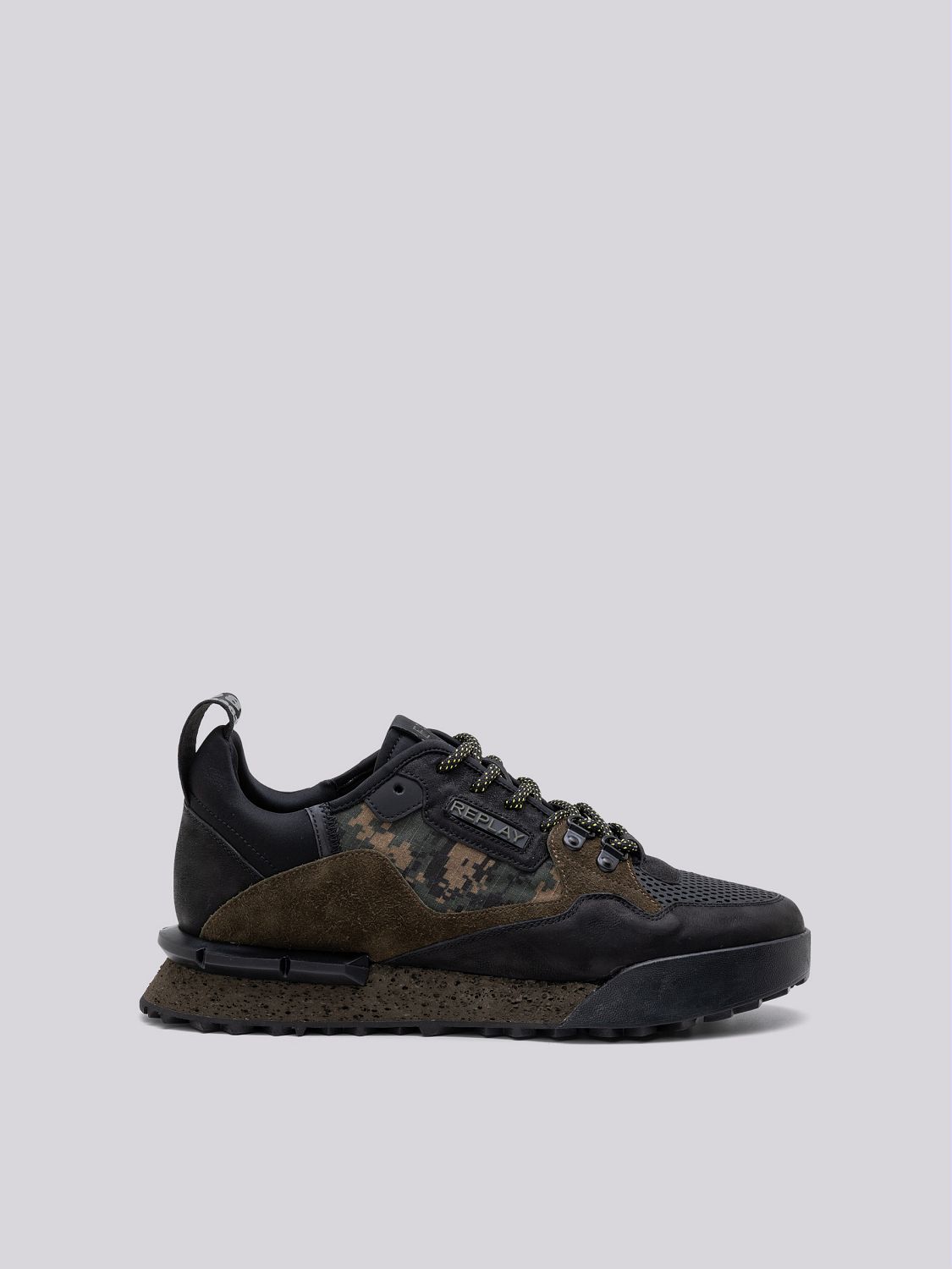 Field Speed Camo lace-up sneakers featuring a soft leather upper with contrasting mesh and suede inserts. They feature a chunky two-tone technical sole. The embossed lettering logo on the side and the custom tape pull-tab on the heel convey the character of Replay’s DNA.