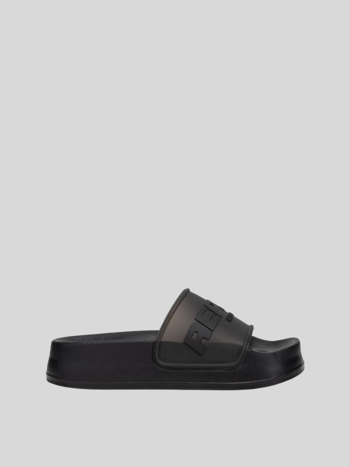 New Lotty Transparent ladies sliders with transparent band and Replay Lettering. Rubber sole.
