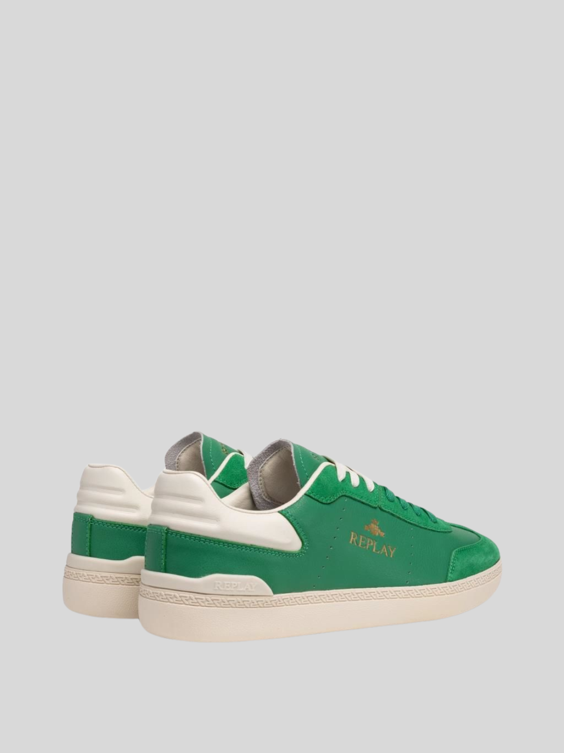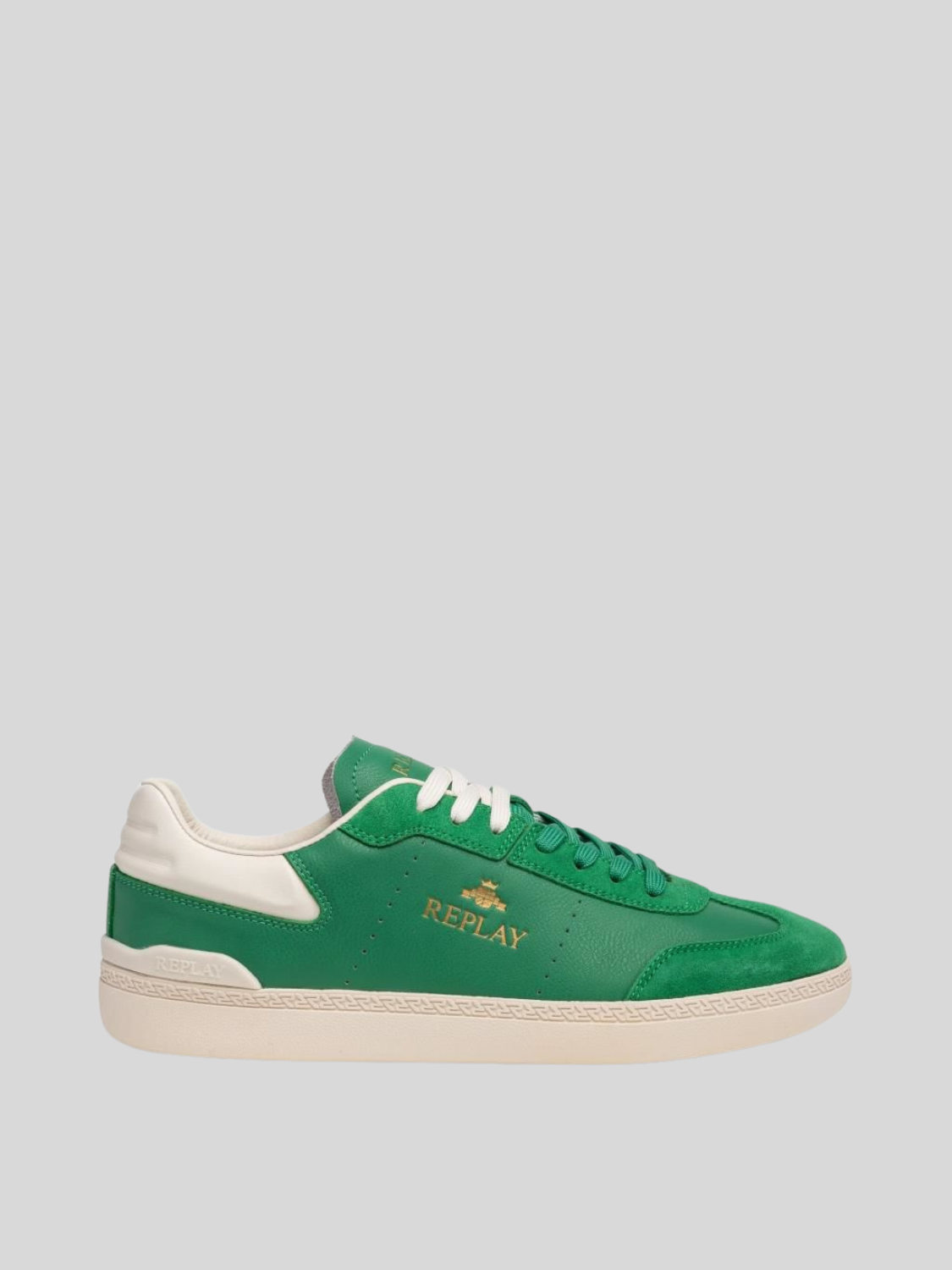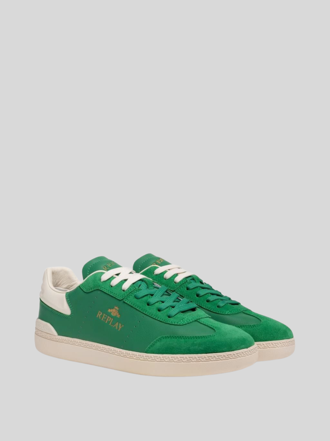 Pyper Double lace-up sneakers featuring a suede and leather upper with perforations on the side and a contrasting heel insert. Replay lettering is embossed on both the tongue and the side of the shoe, along with the archival logo. Flat rubber sole.