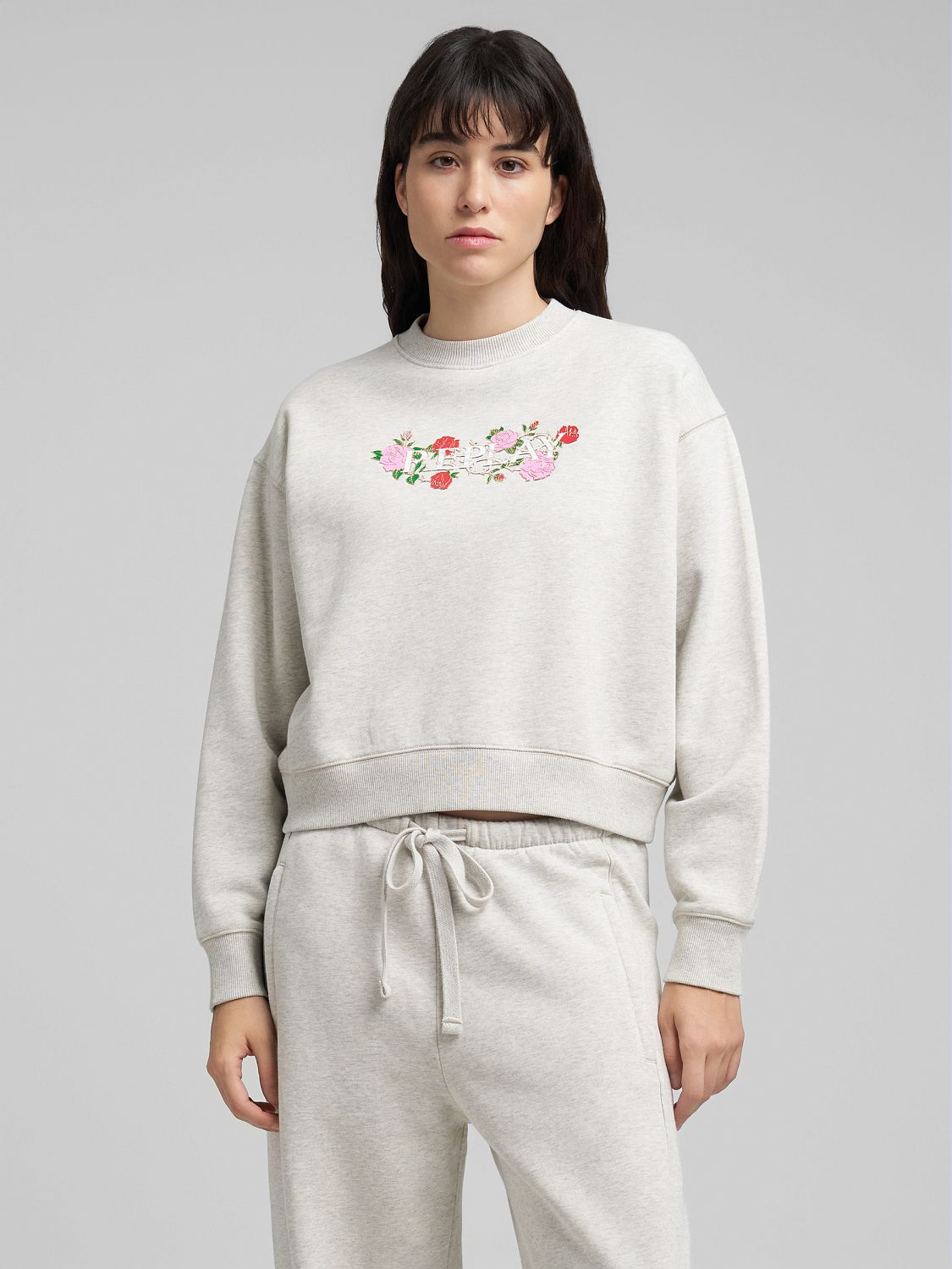 Slightly cropped, crew-neck sweatshirt in pure brushed cotton. This style features long sleeves with dropped shoulders and is finished with a rib-knit neck, cuffs and hem. The piece is embellished with a print in the centre of the chest depicting the Replay logo surrounded by roses.