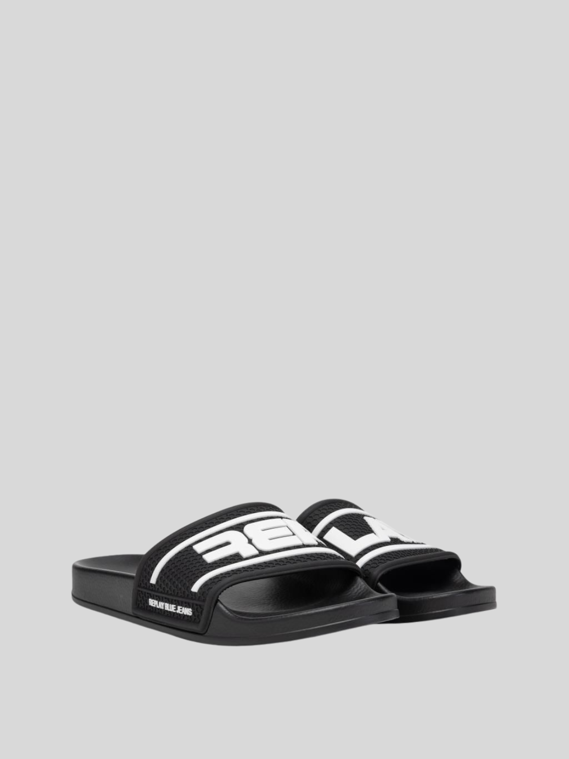 Up Quar P sliders featuring a solid-colour thermoplastic rubber upper with honeycomb design and embossed lettering logo. Flat sole.