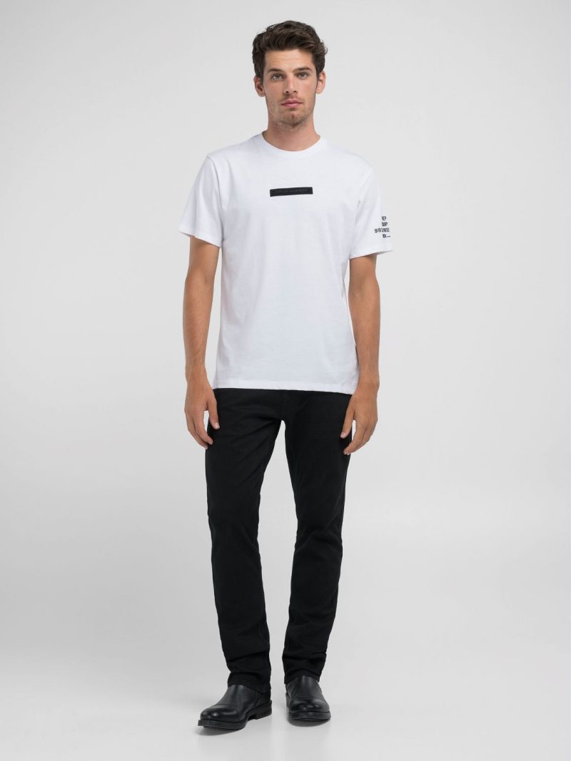 Crew-neck T-shirt in piece-dyed pure cotton jersey, guaranteeing softness and durability. This men’s regular-fit short-sleeved T-shirt features the tonal embossed lettering logo on the chest and a contrasting custom lettering print on the sleeve and side.