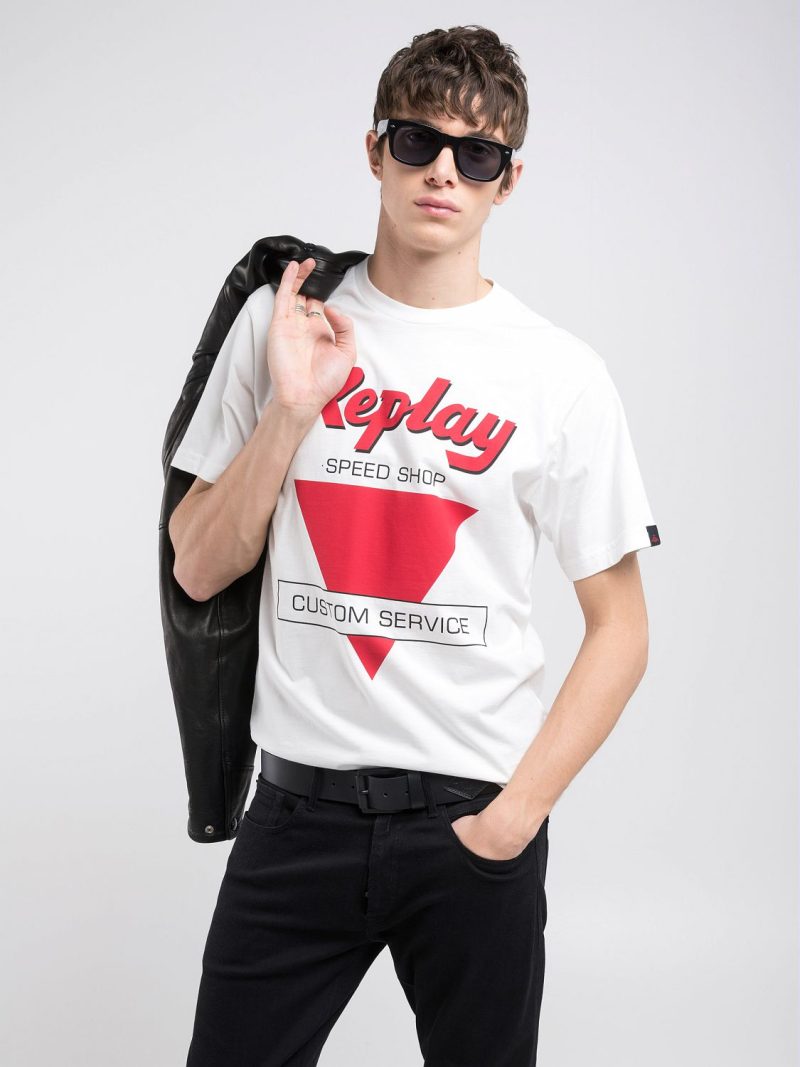 Regular-fit crew-neck T-shirt in pure cotton jersey fabric, the guarantee of freshness and softness. This piece features a custom print on the front that nods to a biker aesthetic. The archival logo label on the sleeve adds some character to the piece.