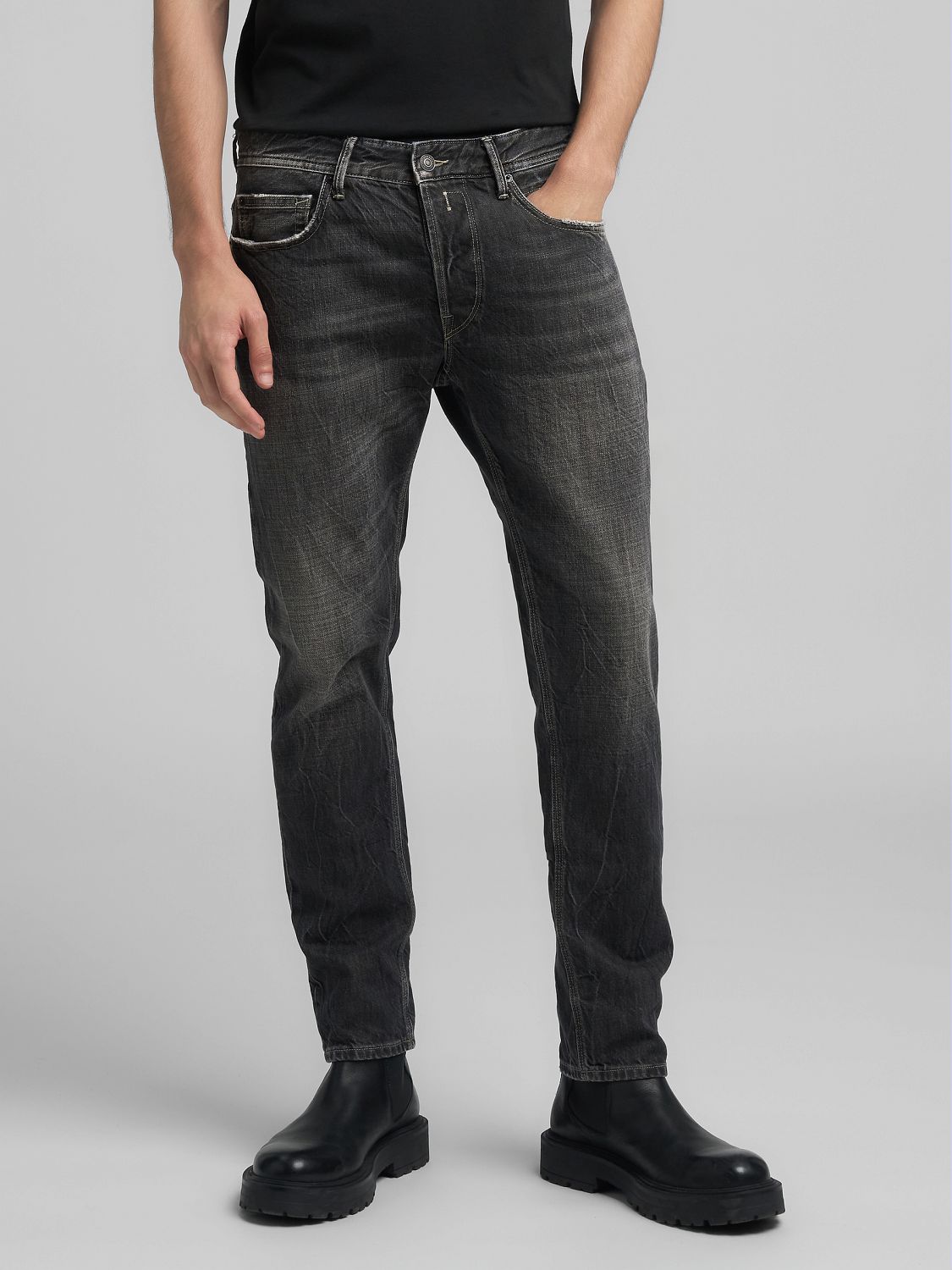 | These regular-fit regular-rise jeans with a leg that tapers toward the hem come in 11-oz black pure cotton denim that has been overdyed in brown with a dark wash. This five-pocket piece features a tied stone wash to give the denim a textured effect and also has hand-whiskering and scraping, localised rips and contrasting detailing on the wear areas to create pure Replay style. Iconic gull-wing stitching distinguishes the back pockets, one of which is finished with R embroidery, while the logo label on the back and small custom insert on one of the front pockets finish off the design. Button fastening. |