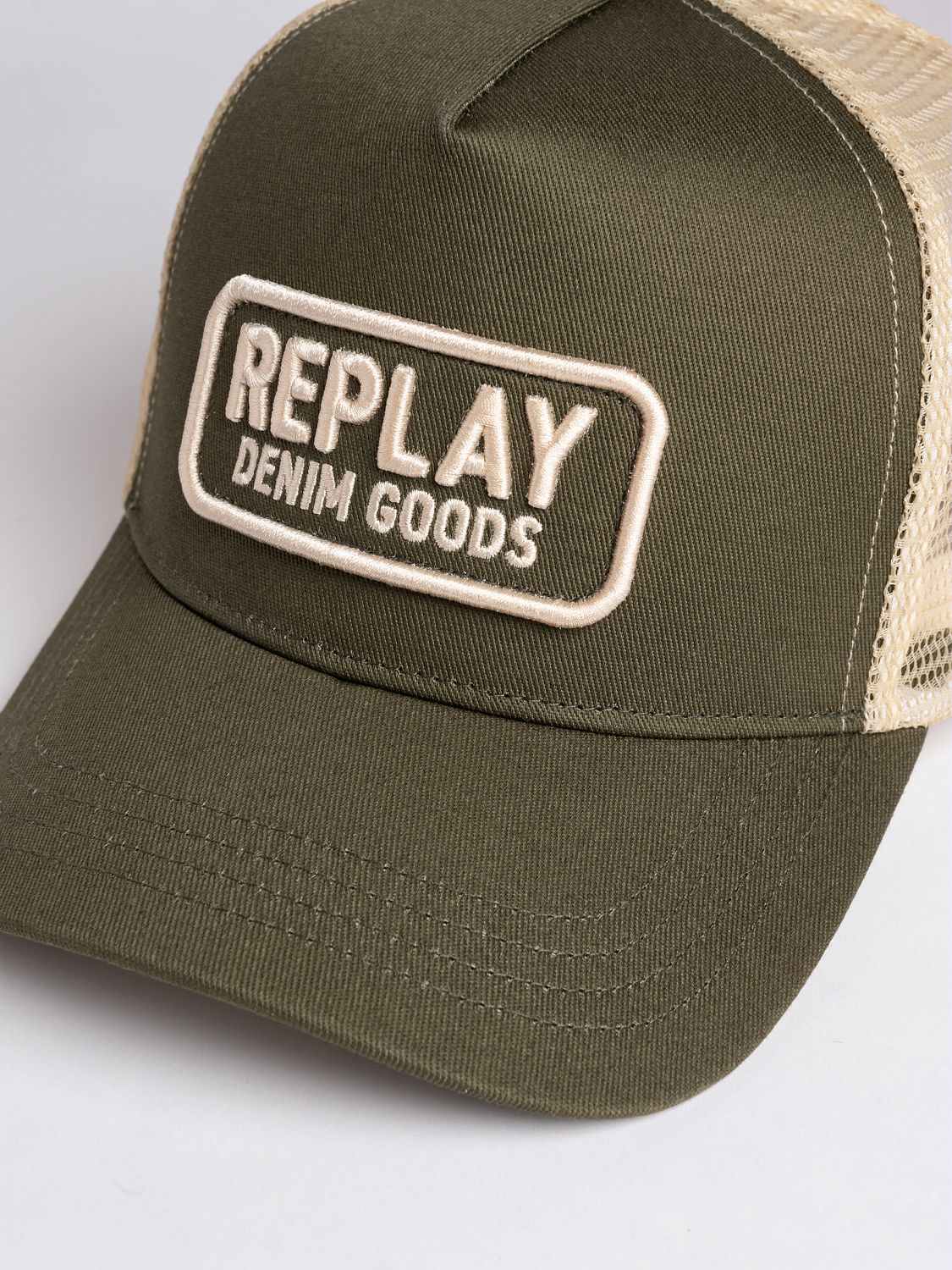 Cotton twill baseball cap with a curved peak and a mesh insert. It features a rectangular patch on the front with embroidered lettering. Adjustable press-stud fastening.
